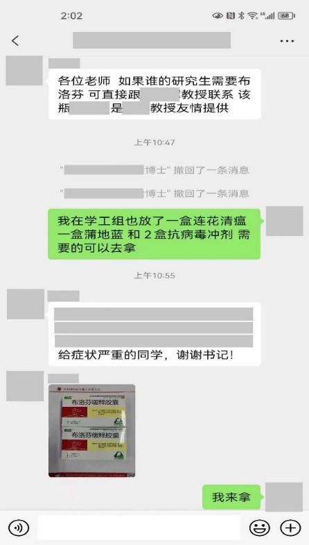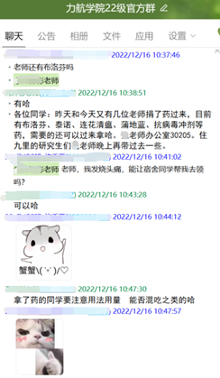 12月15日,力航学院执行院长李翔宇在学院教师群里发出一个消息:各位老师,如果谁的研究生需要布洛芬,可直接跟李映辉教授联系,该瓶布洛芬是杨杰教授友情提供。