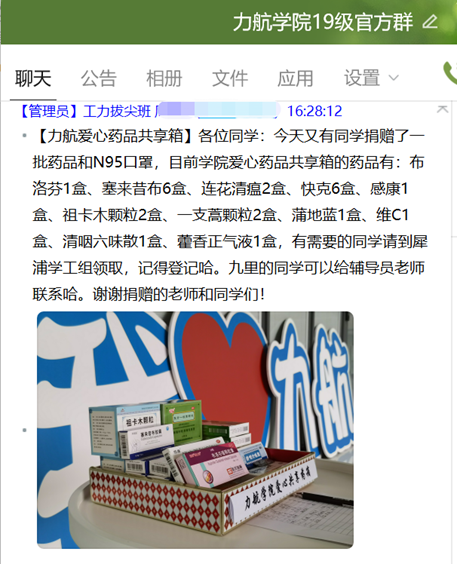 近期,力航学院同学们接连出现了发烧、咳嗽、浑身酸痛等症状。面对一药难求的情况,师生们纷纷匀出自家药物,自愿捐助布洛芬、连花清瘟、泰诺等稀缺药品,给同学们设立爱心共享药箱,受到同学们一致点赞。