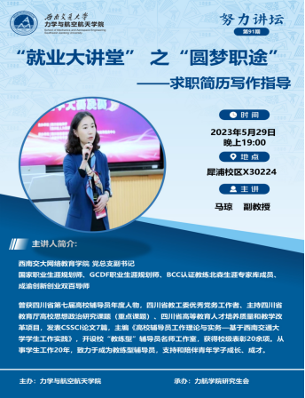 5月29日晚,力航学院邀请学校网络教育学院党总支副书记马琼副教授在X30224会议室为学院2024届毕业生开展了简历制作专题讲座。活动由张容华老师主持。