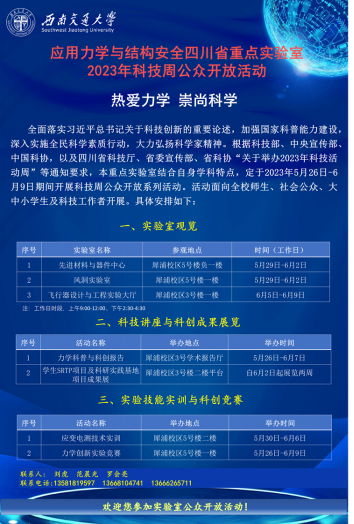 应用力学与结构安全四川省重点实验室结合自身人才培养特色和实验室资源,以“热爱力学,崇尚科学”为主题,面向全校师生、科技工作者、社会公众、大中小学生开展了“科技周公众开放”活动。