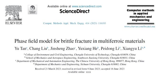 近日,李翔宇教授课题组在多铁性材料裂纹扩展问题研究上取得进展,相关成果以“Phase field model for brittle fracture in multiferroic materials”为题发表在计算力学顶级期刊《Computer Methods in Applied Mechanics and Engineering》(简称CMAME,中科院1区,TOP期刊)上。李翔宇教授为论文通讯作者,成都理工大学青年教师谭宇为第一作者。论文合作者包括助理教授刘畅、博士研究生贺宇翔、香港中文大学赵晋生博士和四川大学李佩栋副教授。