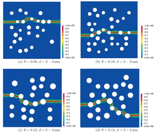 图2:不同孔隙率及孔径大小条件下多铁性材料的断裂模拟