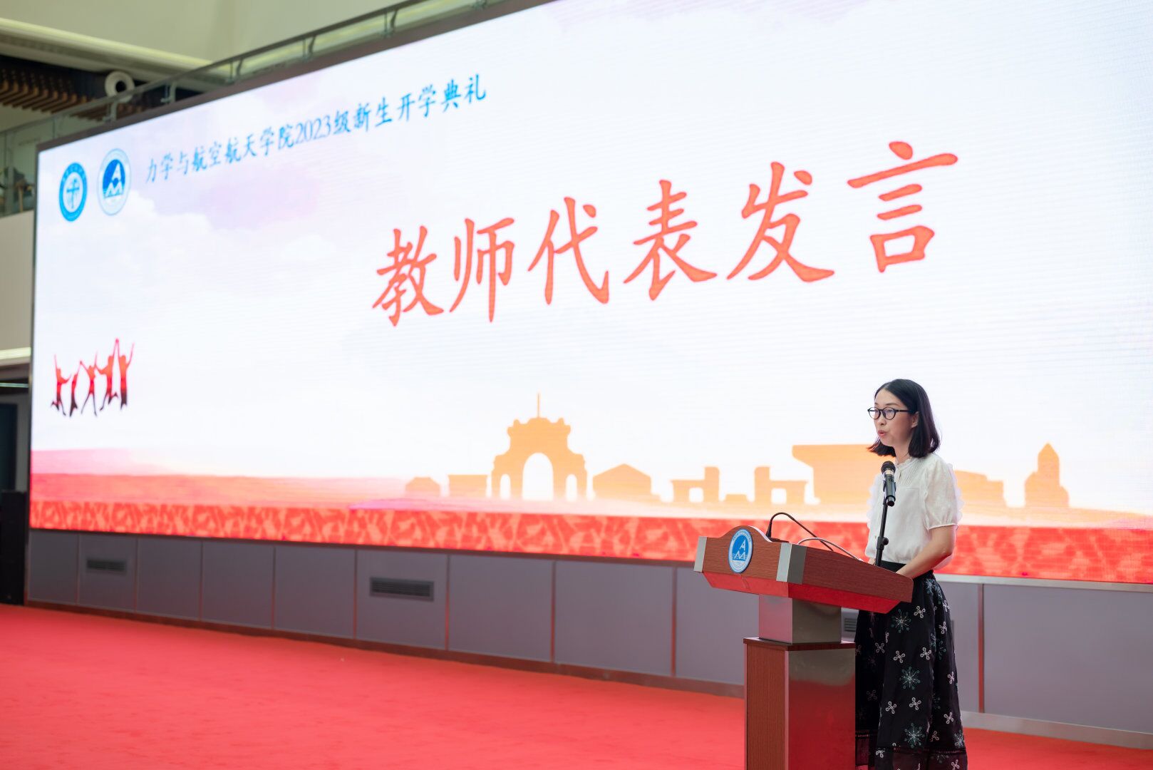典礼第四项,教师代表胡雅楠老师为新生送上开学寄语。如何度过大学和研究生生活,她给出四点建议:第一,保持学习的自律和好奇心,主动探索和深入理解学科的核心概念和原理,为未来的学习和研究打下坚实的基础。第二,积极参与实践和团队合作,勇于面对挑战,寻求解决方案。第三,积极参与集体活动,培养自身的责任感,提高执行力和组织能力,在集体中实现自我价值。第四,主动寻求帮助支持,力航学院有一流的教师团队,会为你们提供全面的学术指导和支持。希望每一位力航学子,都能感受到力航大家庭的温暖。