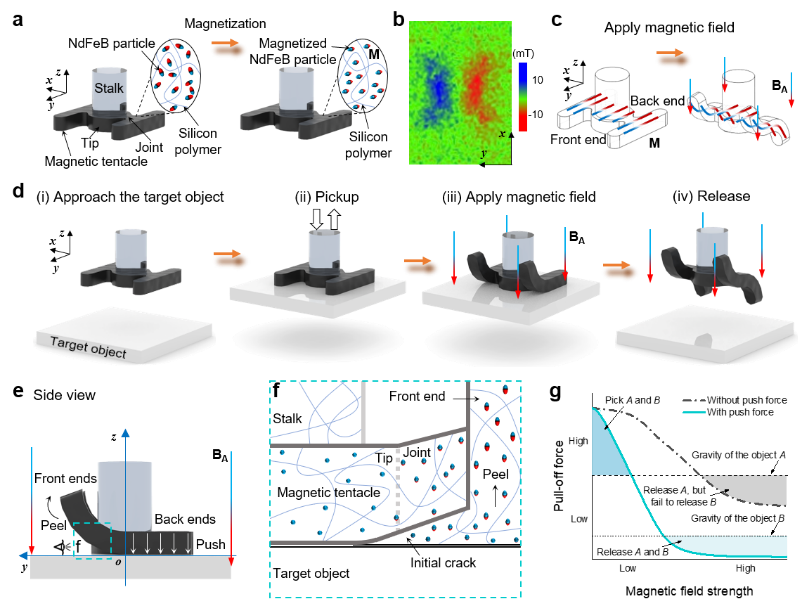 研究人员利用外部磁场以非接触的方式驱动磁性触手扭转变形,不仅能在粘附界面产生初始裂纹,使得粘附性大幅降低,还能对目标物体产生推开的作用效果。相比较团队前期的工作,这种智能粘附材料的粘附性调控范围更大。磁驱动粘附材料的粘附性调控机理如图1所示。此外,研究人员根据上述机理,对磁驱动粘附材料从粘附界面的失效形式、裂纹的扩展方式以及推开力的作用效果三个方面进行结构设计。针对粘附界面的失效形式,根据有限元数值计算结果分析了粘附界面的应力分布情况,解释了随着端头直径的增大粘附界面初始裂纹的产生位置由粘附界面的边缘向中心转变的内在原因,提出既能满足粘附性调控机理又能实现最大粘附性的结构尺寸。对于裂纹的扩展方式,研究人员根据铁木辛柯梁理论和最小势能原理得到初始裂纹长度随外部磁场强度的变化规律,得到能满足裂纹扩展到主要粘附区域的结构尺寸的临界值。此外,研究人员通过理论分析得到磁性触手结构尺寸对推开力的影响规律,并得到实验结果的佐证。
