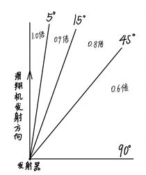 以发射器延长线为轴,10度之内为1.0倍得分区(D=1.0);10~30度内为0.9倍得分区(D=0.9);30~90 度内为0.8倍得分区(D=0.8);90度之外为0.6倍得分区(D=0.6)。记三次发射过程中的对应的偏离系数分别为Di1, Di2, Di3。