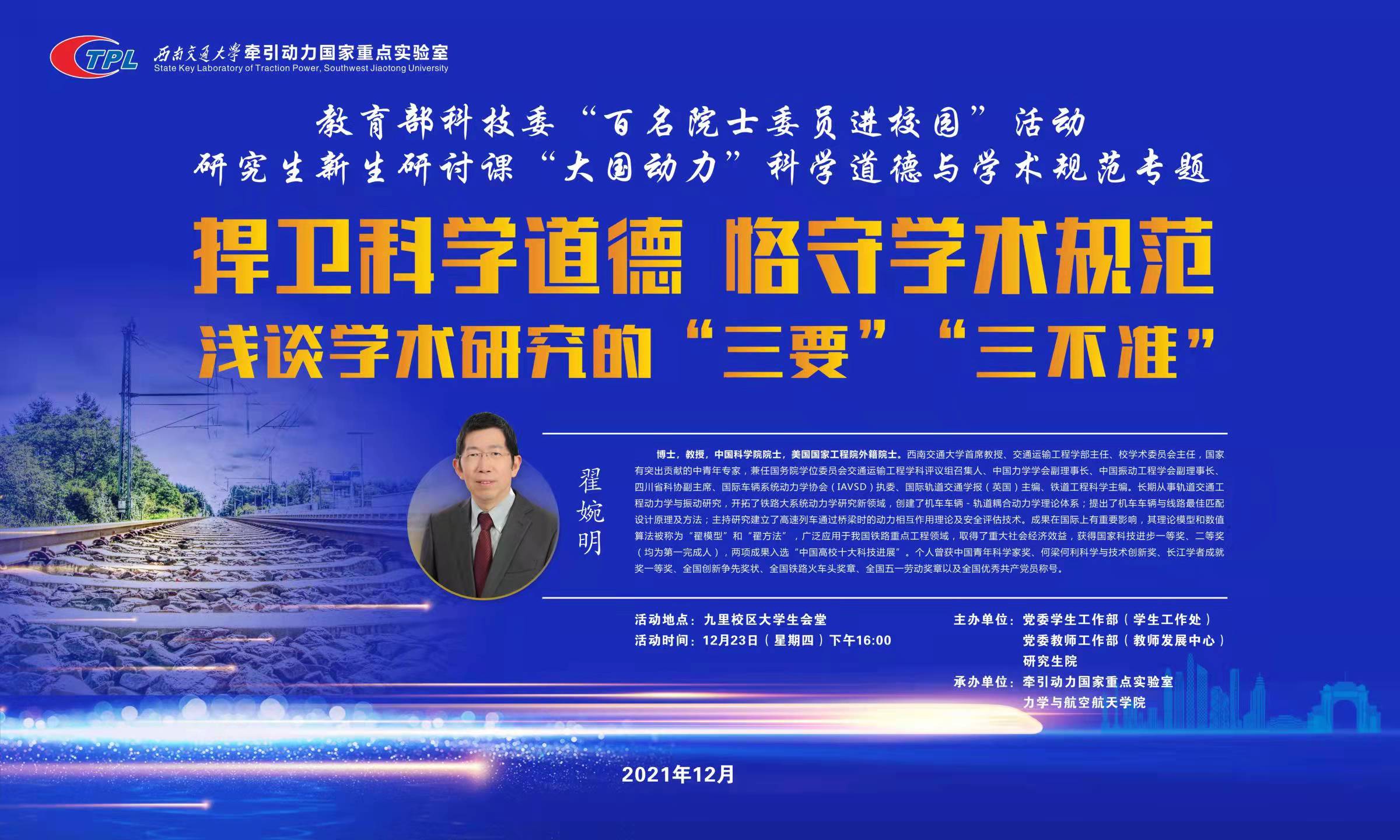 承办,特邀中国科学院院士、美国国家工程院外籍院士翟婉明教授开展“捍卫科学道德 恪守学术规范”专题讲座。现就相关事宜通知如下: