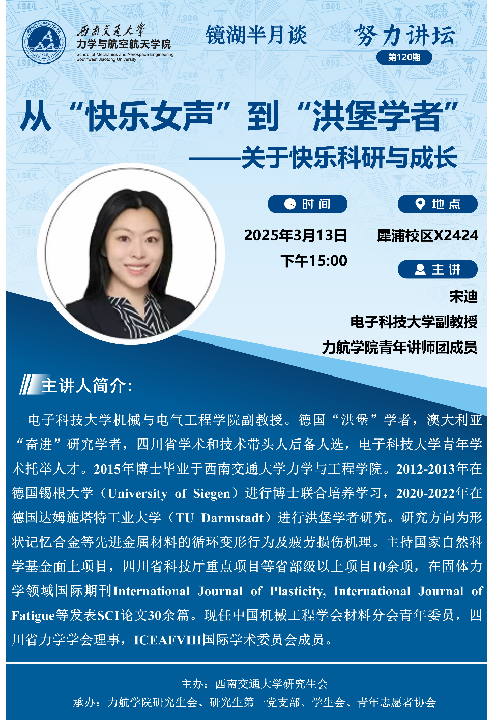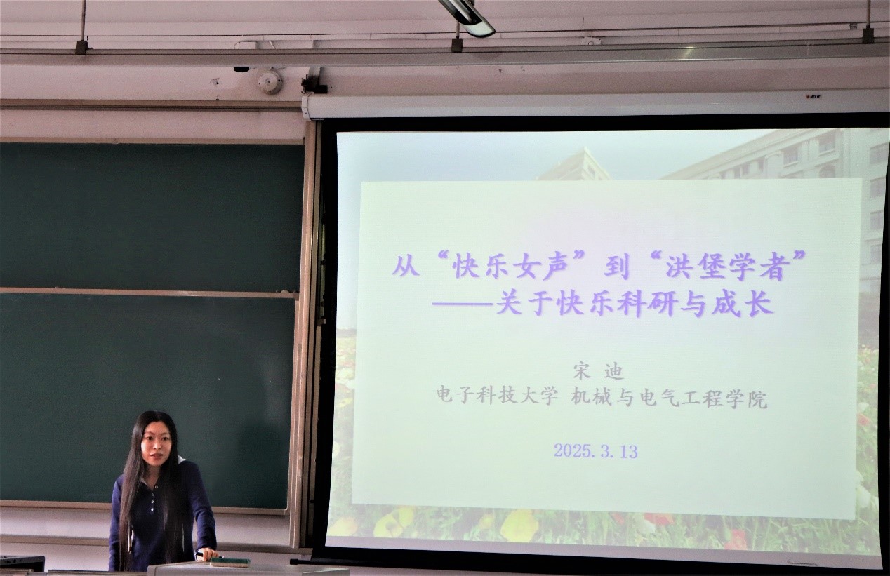 2025年3月13日下午3点,我院力学2010级校友、电子科技大学机械与电气工程学院副教授宋迪老师受邀在X2424带来了一场以“从快乐女声到洪堡学者——关于快乐科研与成长”的讲座。学院党委书记栗民、辅导员安晟斐、学院2024级研究生、学院研究生第一党支部成员出席此次活动,现场气氛热烈。
