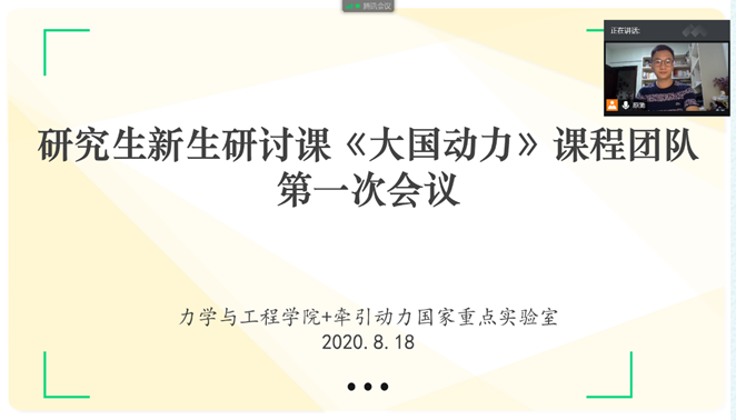 为加强课程建设,《大国动力》课程团队于8月19日晚上8:00-10:00以线上会议的形式举行了第一次会议。牵引动力国家重点实验室党委副书记、副主任王锋、党委副书记李莹、教师朱涛、罗仁、陶功权、赵鑫、李向蔚、余卉、柴一菲和力学与工程学院党委副书记孔祥彬、副院长阚前华、教师刘金铃、张旭、苗鸿臣、张英蓉、刘科宏参加了会议,会议由孔祥彬主持。