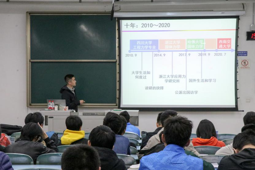 刘老师本科就读于四川大学,后保送到浙江大学航空航天学院直接攻读固体力学博士学位,师从曲绍兴教授。在读博期间,受国家留学基金委资助,赴美国哈佛大学锁志刚院士课题组进行了2年的访问学习。刘老师以自己从2010年到2020年十年间在不同阶段的学习经历为线索,从大学生活该如何度过谈起,为同学们讲述了本科以及博士期间在学习、生活中的感悟,鼓励同学们找准自己的兴趣点,多问、多听、多看、多想,不虚度大学时光。