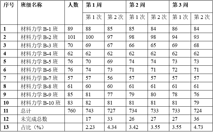 最后,龚晖教授报告了SOTS后台记录的前三周学生学习材料力学的大数据反馈结果(如表1和表2所示),2149名学生中约有95%的同学能够很好地完成任课教师发布的学习任务(包括教学视频和网上作业)。材力AII没有完成学习任务的学生人数最多一次为78人,占5.61%;材力B没有完成学习任务的学生人数最多一次为36人,占4.73%。二者之和最多为114人,这与开课之初统计到的100名左右没有在线学习条件的学生人数具有一定的相关性。以上数据表明,在全体材料力学课程团队成员的努力下,线上授课运行秩序和效果良好。此外,有相当多的学生表示SOTS平台的学习效果优于其他线上教学平台,表明我校自主开发的SOTS平台经受住了疫情的考验。