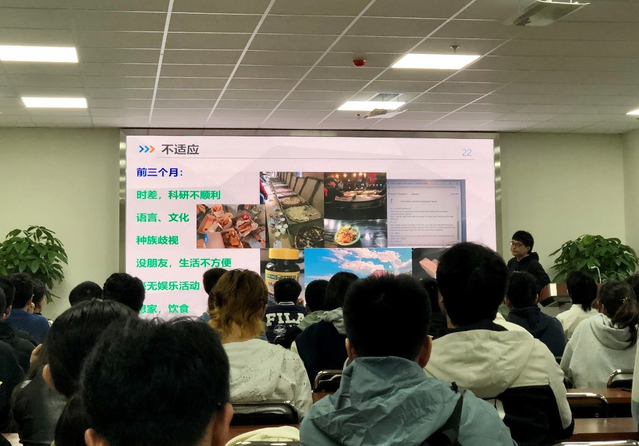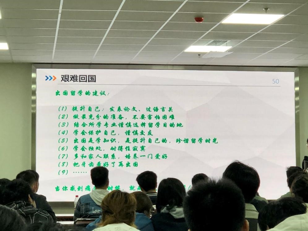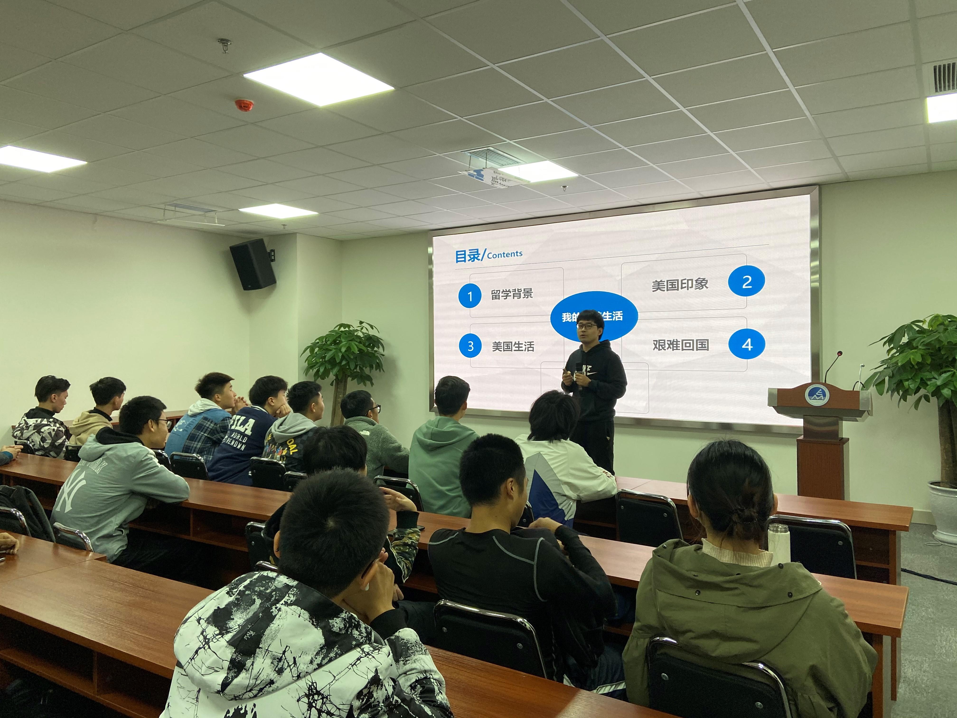 王老师从他的研究课题出发,向同学们介绍了赴美留学的背景、美国印象、在美的学习生活等内容,提醒大家出国留学前一定要想明白出国留学的原因,明确自己的目标。