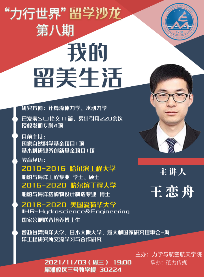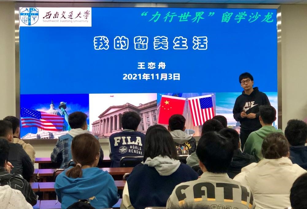 11月3日晚,力航学院“力行世界”留学沙龙活动第八期活动在犀浦校区X30224会议室举办。本次沙龙邀请学院青年教师王恋舟老师担任主讲嘉宾,为同学们分享自己的留美生活。活动由张容华老师主持。