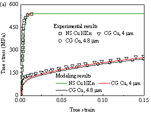 图2.(a)均匀晶粒结构Cu、Cu10Zn的模拟结果与实验结果的对比;(b)不同层厚的层状Cu/Cu10Zn的模拟结果与实验结果的对比