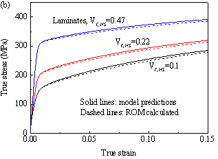 图3. (a)不同纳晶层体积分数的层状Cu/Cu10Zn的模拟结果与实验结果的对比;(b)模拟结果与简单混合法则的计算结果对比
