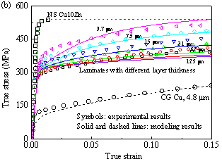 所建立的本构模型可以很好地描述不同晶粒尺寸的均匀晶粒材料以及不同层厚的层状材料的单轴拉伸响应,如图2所示。