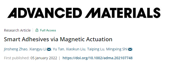 李翔宇教授与师明星教授领导的课题组最新科研成果“Smart Adhesive via Magnetic Actuation”在国际顶级期刊《AdvancedMaterials》(IF: 30.849)上在线发表。李翔宇教授和师明星教授为论文的共同通讯作者,第一作者为博士研究生赵晋生,共同作者有博士研究生谭宇、博士研究生刘晓坤和硕士研究生鲁太平,均来自力91直播
