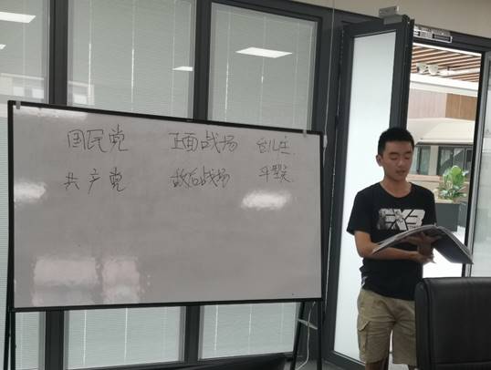 寿毅航同学首先讲述到有关全民族抗日战争的相关内容。1937年7月7日,日军侵略军悍然发动了卢沟桥事变,揭开了全国抗日战争的序幕。《论持久战》中将战争划分为三个阶段:防御阶段-相持阶段-反攻阶段,寿毅航同学分别介绍了国民党和共产党在三个阶段中各自的抗战表现,在民族危亡的历史关头,中国共产党始终高举抗日民族统一战线的旗帜,坚持独立自主、团结抗战,同时勇敢地奋斗在抗战的而最前线,支撑起了中华民族救亡图存的希望。此外他呼吁大家作为新时代的青年党员,应该铭记历史,不忘初心。