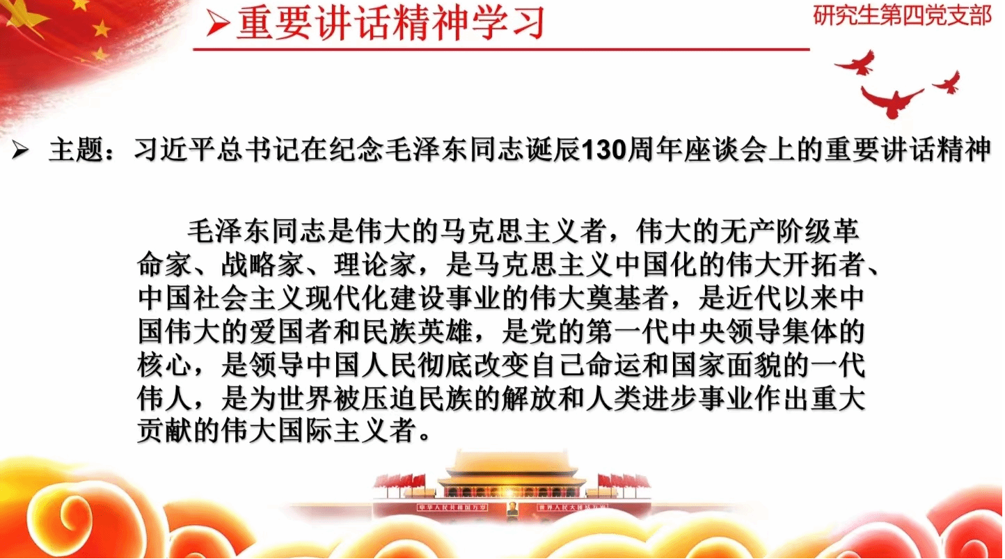 然后,支部党员学习了习近平总书记在纪念毛泽东同志诞辰130周年座谈会上的重要讲话精神。