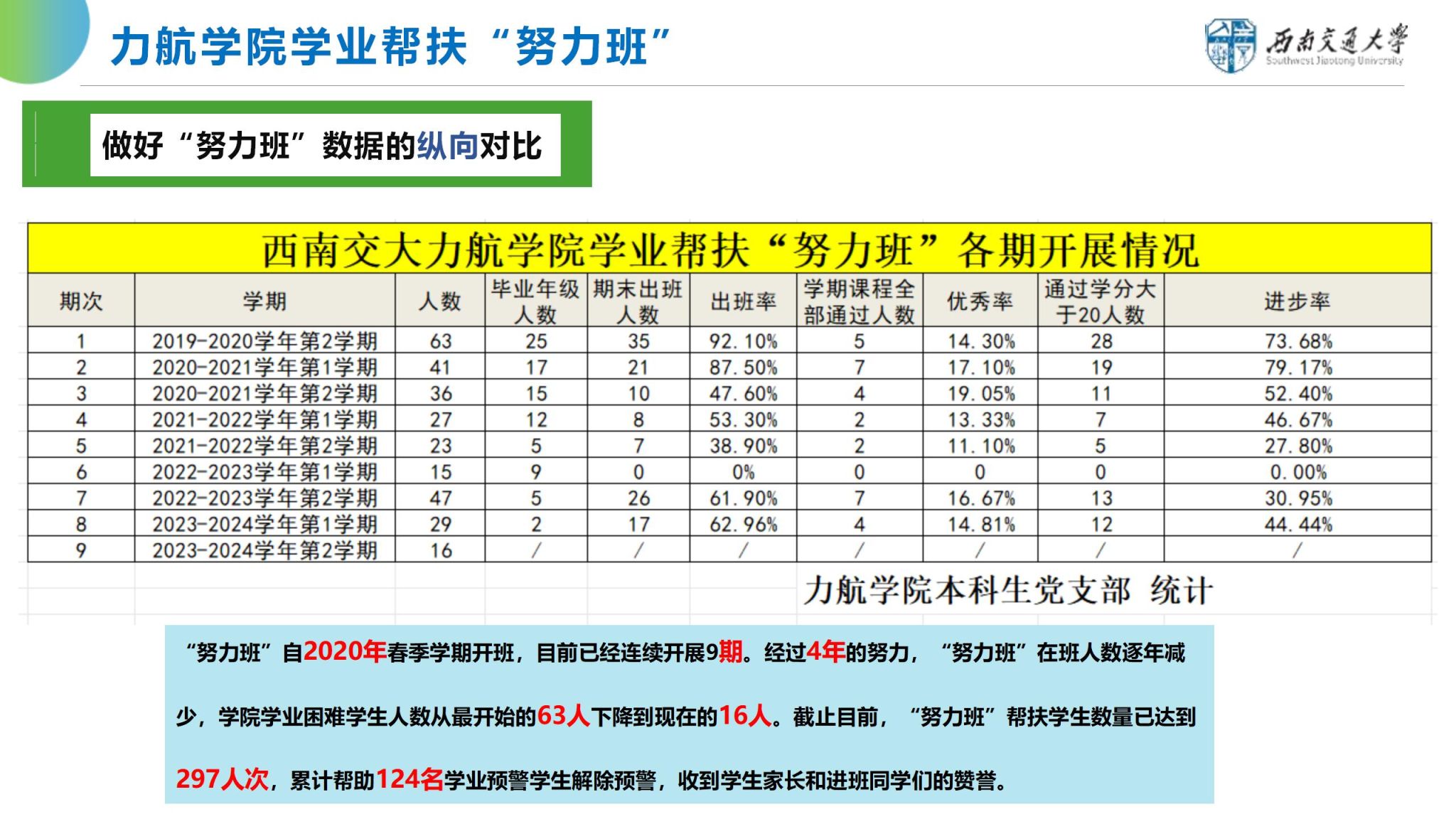 学业帮扶“努力班”是力航学院组建的一个虚拟班级,以帮助学习困难学生提升自我管理能力和自主学习意识、提高学生的学习效率与学习成绩为目的。目前,“努力班”已经持续开展至第十期。本科生党支部成立党员先锋队,常态化为“努力班”每个同学提供《力学秘笈》、开展个性化“一对一”、每周精品例题分享与讲解、期中考试前资料分享、期末考试前答疑等帮扶措施。四年来,努力班“努力班”帮扶学生数量已达到297人次,累计帮助124名学业预警学生解除预警,出班率达到65.69%,进步率达到84.60%。