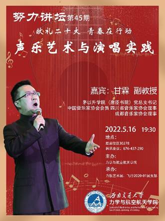 5月16日19:30,茅以升学院(唐臣书院)党总支书记甘霖老师受邀做客“努力讲坛”第45期,讲座主题为“声乐艺术与演唱实践”。本次讲座由力航艺术团、飞行2020-01团支部承办,采用线下与线上直播同时进行的方式。力航学院党委书记栗民、学生工作组杨婧老师、周子涵老师以及力航学院本、研各年级同学参与了讲座。
