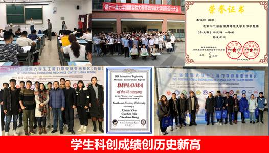 承办第十二届全国周培源力学竞赛四川赛区竞赛、校第十一届力学创新实验大赛暨第四届力学创新设计大赛、第一届有限元分析与建模大赛。组织学生参加全国周培源大学生力学竞赛和第一、二届国际大学生工程力学竞赛,获全国大学生周培源力学竞赛一等奖1项、二等奖1项、三等奖21项;获国际大学生工程力学竞赛亚洲赛区个人赛特等奖2人、一等奖9人、二等奖6人,团队赛获一等奖1队、二等奖4队,并获团体一等奖,均创学院最好成绩。