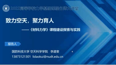 随后,李道奎教授做主题报告《致力空天、聚力育人——材料力学教学改革探索与实践》。李道奎教授首先介绍了国防科大空天科学学院力学教学工作现状及课程建设情况,并结合历史发展与当前实际形式指出了其所在学院力学课程目前面临的四个挑战,即:课程内容与空天科学联系较弱、教学内容时空覆盖面窄、思政教学隐性融入难和年轻教师提升速度慢。随后,李道奎教授针对性的提出了“四结合”的解决方案,即:建设理论与实践相结合的工程导向型的课程内容体系、建立实体资料与虚拟资源相结合的教学资源、践行“外力”与“内力”相结合的课程思政法、成立名师与新秀相结合的人才培养机制。最后,李道奎教授就“四结合”方案的实施成果为大家做了简要介绍。